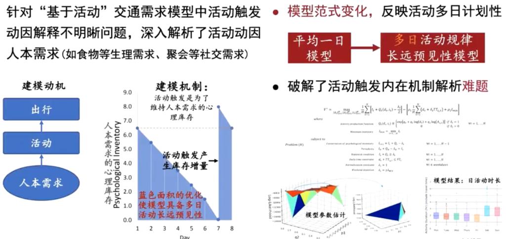 针对交通需求模型中活动触发动因解释不明晰问题,提出“基于本质需求”交通规划建模与仿真理论方法,突破了活动触发动因——人本需求的心理库存解析难题,推动了模型具备多日活动长远预见性的范式变化,应用于中国、美国、新加坡等 13 个城市出行即服务、自动驾驶、低空等新技术的潜在交通需求分析。