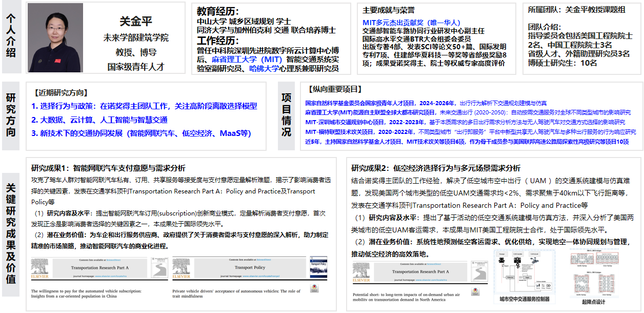 2025.09.28一、个人介绍姓名:关金平职称:教授,国家级青年人才所属单位:建筑学院联系方式:melon_ping@163.com二、科研方向介绍主要研究领域:选择行为与政策,交通系统分析,大数据、云计算、人工智能与智慧交通,新技术下的交通协同发展(如智能网联汽车、出行即服务、低空经济等)研究背景与意义:交通如人体血液循环系统一般,是国家经济命脉。提高交通系统运行效率,重在供需匹配。新技术的出现,改变了选择行为与交通需求,如何...